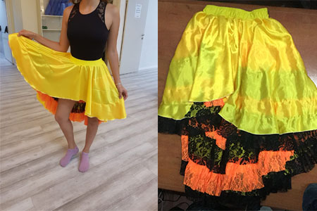 מק״ט s1007 חצאית חיוכים. חצאית צהובה עם וולנים כתום ושחור מבפנים. מתאים לגילאי חטיבה ותיכון. כמות: 40