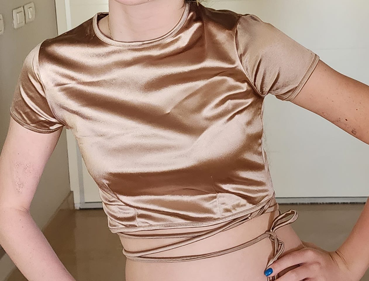 מוק״ט L6050 טופ/חולצה זהב סאטן עם שרוול קצר וחוטים